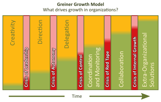 Larry E. Greiner describes six stages divided by five crises in organizational growth.
